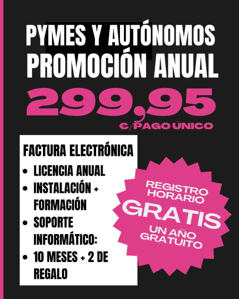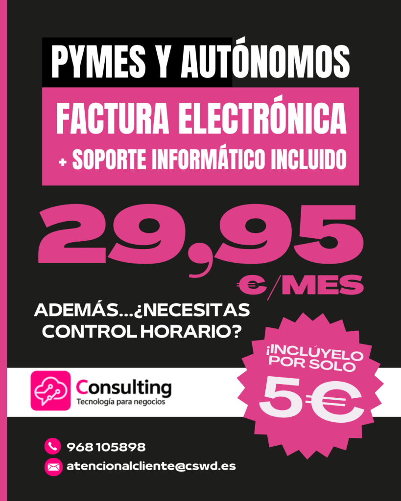 Ahora puedes digitalizar tu empresa con nuestra solución de factura electrónica y disponer de soporte Ttécnico con nuestro servicio de mantenimiento informático. TODO INCLUIDO desde tan solo 29,95 € al mes.